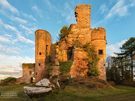 Etwa zwei Kilometer nordwestlich von der Stadt Dahn entfernt ragt auf einem Bergrücken die Felsenburg Neudahn in die Höhe.