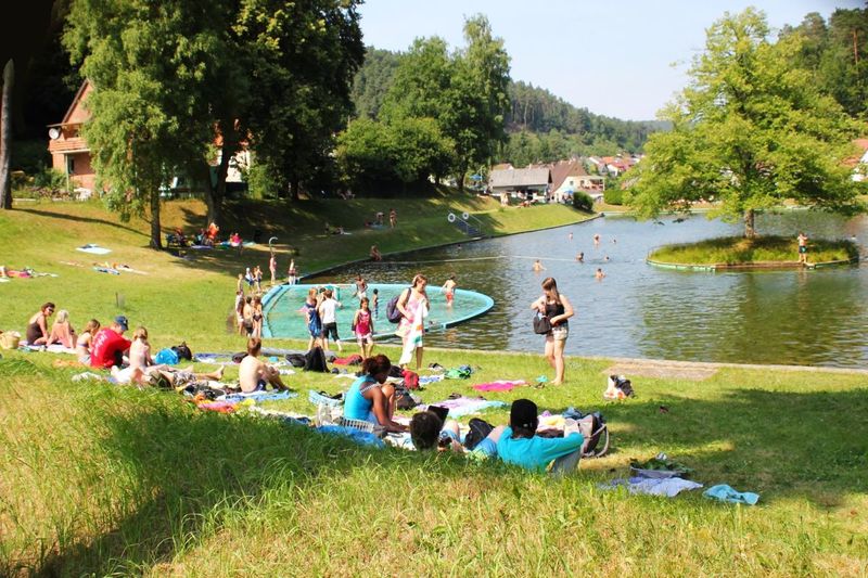 ...wie das Gewässer auch genannt wird, kann man problemlos den ganzen Tag verbringen. Nach der ersten Zeit im Wasser holt man sich ein kaltes Getränk vom Kiosk, aalt sich in der Sonne, spielt vielleicht noch eine Runde Minigolf oder verbringt noch mehr Zeit im Wasser, um der Hitze zu entgehen. In aller Ruhe kann im Weiher geplanscht, gebadet und geschwommen werden - und das eben so natürlich, wie es nur geht.