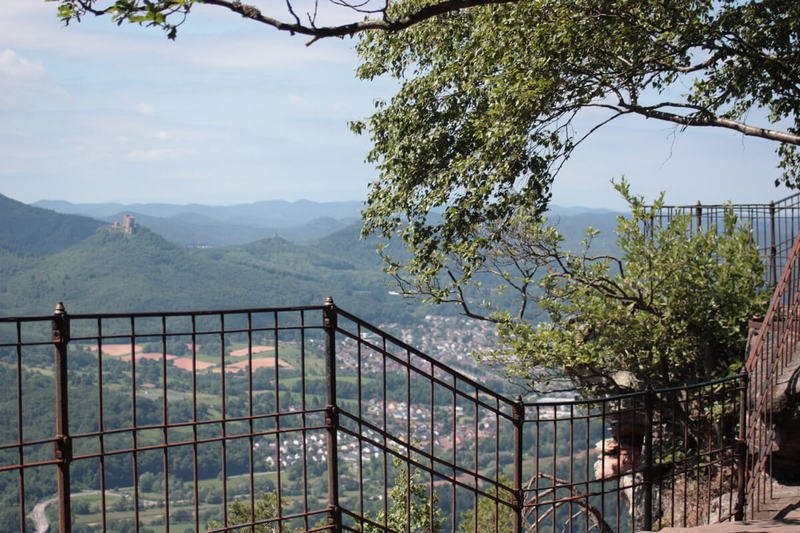 Aus knapp 600 Metern Höhe reicht das Panorama im Westen über Annweiler, die Reichsburg Trifels mit den Vorburgen, über den Hoheberg und weiter über die Hügellandschaft in der Südpfalz bis über die Rheinebene in den Schwarzwald und den Odenwald.