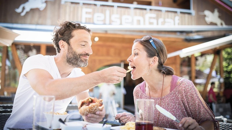 Daneben sind die Burger des Hauses zu empfehlen. Beim Steakhouse-Burger auf der Grundlage von bestem Bison, Wagyu Prime Beef legt der Chef wert auf ein saftiges- und intensives Geschmackserlebnis. Eine Auswahl von Pizza, Pasta und Salaten lässt keine Wünsche offen. Und wer es nach einer Wanderung auf dem direkt am FelsenGraf beginnenden Dahner Felsenpfad deftig mag, entscheidet sich auch gerne mal für Schnitzel, Ofenkartoffeln oder Knödel.