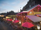 Natürlich zieht es die meisten Gäste bei schönem Wetter im Dahner Felsenland in der Pfalz auf die Sonnenterrasse. Von dort hat man den direktem Blick zur Felsformation Braut und Bräutigam oder auf die Felsen oberhalb des Felsenpfades, einem von 12 Premiumwanderwegen im Felsenland Dahn.